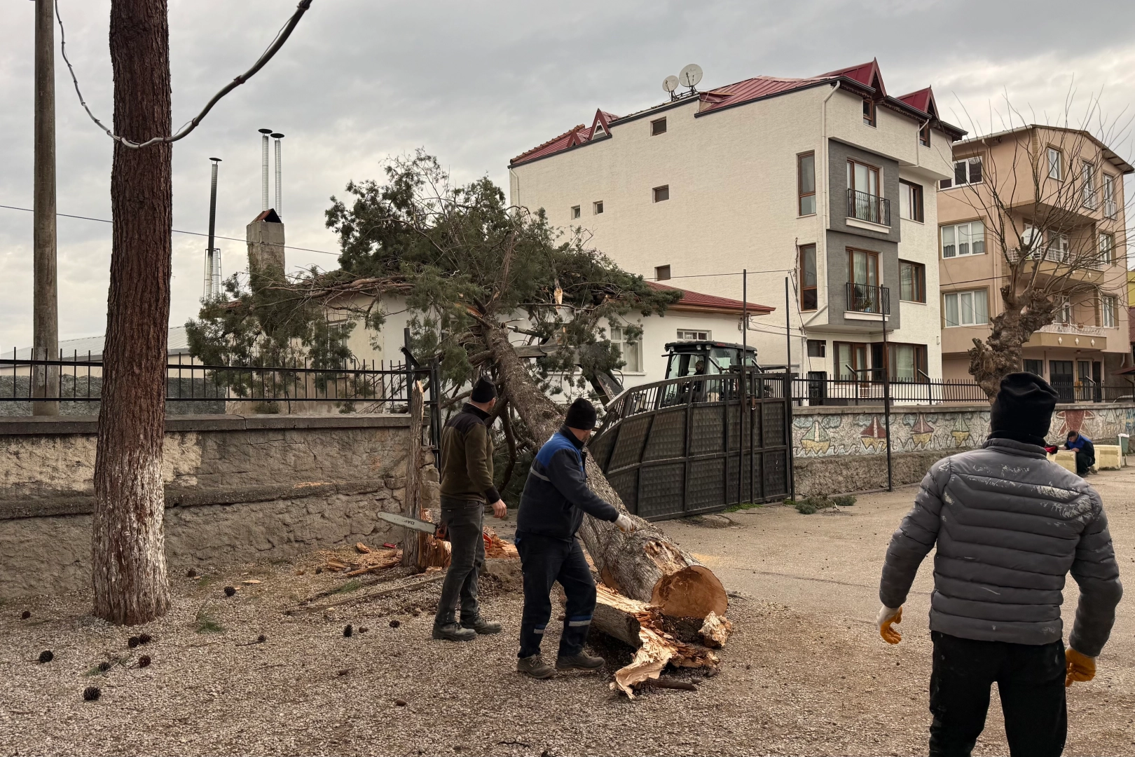 Devrilen çam ağacı nedeniyle Alparslan İlkokulu ve Ortaokulu'nun demir bahçe kapısı ile bahçe duvarlarında da zarar oluştu. Olayın, okulların tatil olması nedeniyle yaşanması muhtemel bir faciayı önlediği belirtildi. Olay sırasında okul bahçesinde öğrenci bulunmaması büyük bir tehlikenin önüne geçti.