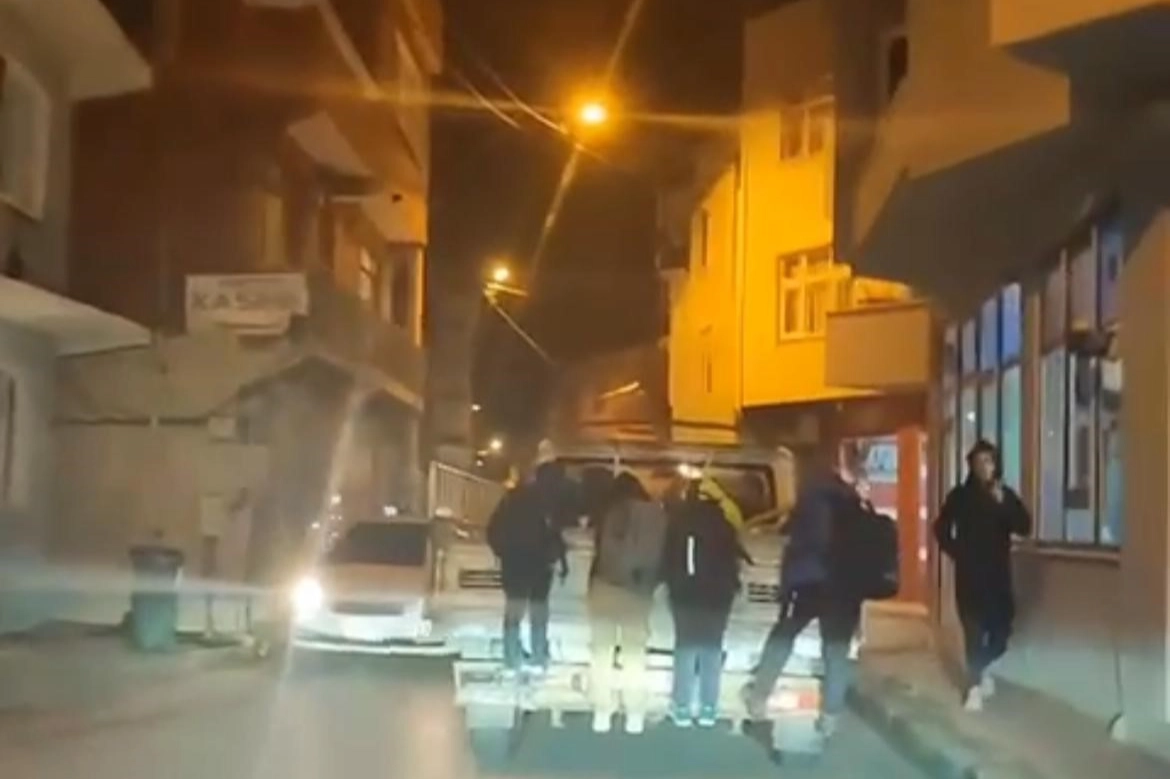 Bursa’nın Osmangazi ilçesi Merinos Mahallesi üzerinde açık kasa bir kamyoneti gören çocuklar, aracın kasasına tutundu.