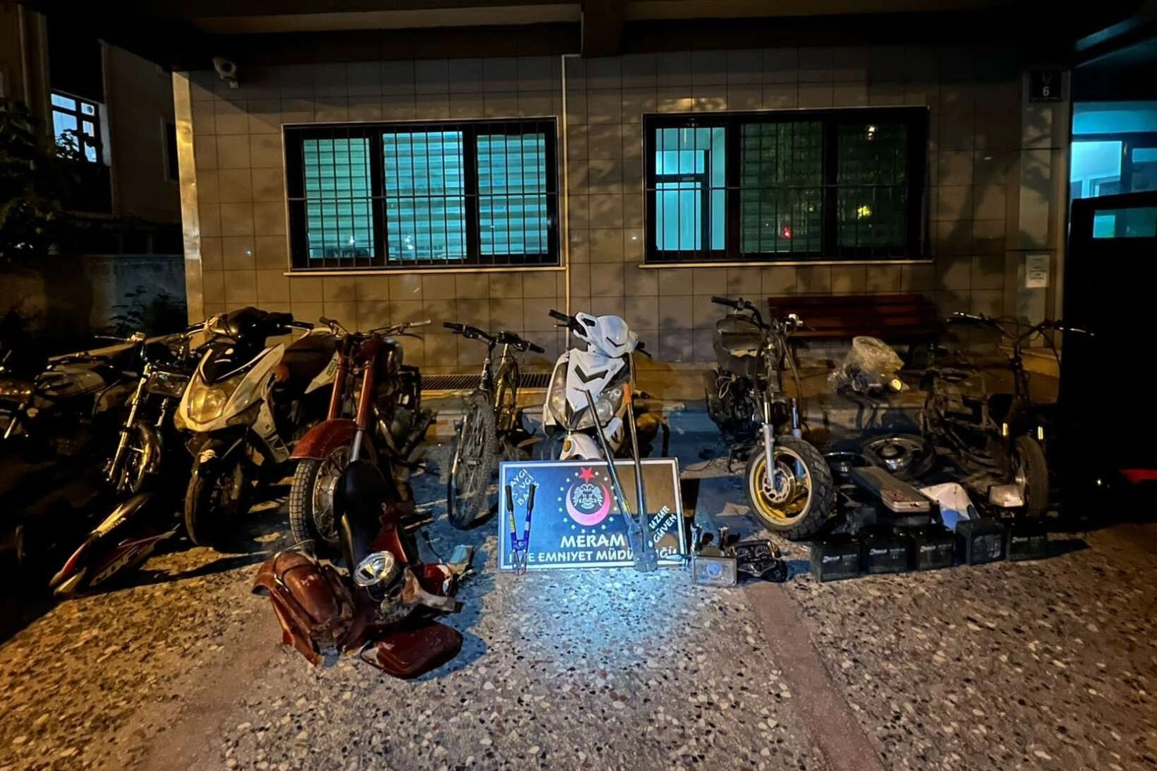 Şahıslar hakkında adli işlem başlatılırken yaşanan bir motosiklet hırsızlığı güvenlik kamerasına yansıdı. Edinilen bilgiye göre, Konya Emniyet Müdürlüğüne bağlı Meram Suç Önleme ve Soruşturma Büro Amirliği ekipleri, gerçekleşen faili meçhul olayların çözümlenmesi ve şüphelilerinin yakalanmasına yönelik yapılan çalışmalarını sürdürüyor. Ekipler izledikleri yüzlerce güvenlik kamerasıyla, 9 ayrı motosiklet ve elektrikli bisiklet hırsızlığını gerçekleştiren 9 şahsı yakalayarak gözaltına aldı. Polis ekiplerince 7 suç kaydı olan M.M. (25), M.S. (21), 13 suç kaydı bulunan A.T. (29), 7 suç kaydı bulunan M.S. (31), 14 suç kaydı bulunan M.F. (18), 4 suç kaydı bulunan A.H. (21), 2 suç kaydı bulunan M.H. (34), A.A. (18) ve 5 suç kaydı bulunan A.N. (18) yakalanarak gözaltına alındı. Emniyete götürülen şahıslar hakkında adli işlem başlatılırken ele geçirilen motosikletler sahiplerine teslim edildi. Hırsızlık anı kamerada Yaşanan elektrikli bisiklet hırsızlığı ise güvenlik kameralarına yansıdı. Görüntülerde bisikletle gelen 2 şahsın öncelikle tespit ettikleri elektrikli motosikleti bir süre gözlemlediği, şahıslardan birinin elektrikli motosikletin yanına gittiği, diğer şahsın ise bisikletle gözcülük yaptıktan sonra demir makasını arkadaşına verdiği ve demir makasıyla kilidi keserek elektrikli motosikleti alıp oradan uzaklaştıkları görülüyor.