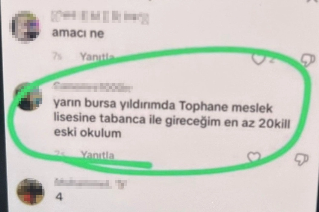 Öte yandan, Şanlıurfa ve Kahramanmaraş’ta yaşanan okul saldırılarının ardından bir paylaşımın altına "sıra bende" şeklinde yorum yapan bir başka kişinin de Bursa’da yaşadığı tespit edildi. Kimliği belirlenen Y.İ. (19), polis ekiplerince düzenlenen operasyonla yakalanarak gözaltına alındı.