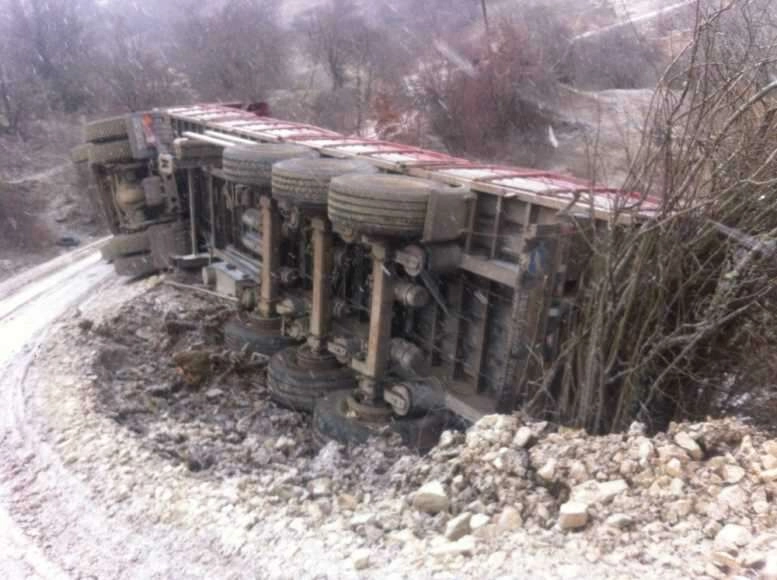 Bu sabah saatlerinde Büyükorhan ilçesine bağlı Tekerler köyünde meydana gelen olayda, mermer ocağından aldığı mermer blokları taşıyan TIR, buzlanmanında etkisiyle virajı alamayarak devrildi. Faciadan dönülen olayda köylüler yardıma koşarken, yara almayan şoför kendi imkanlarıyla çıktı.
