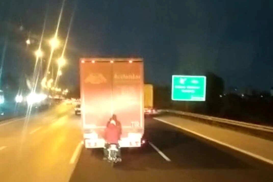Hatay'dan Adana istikametine giden tır, otobanda seyir halindeyken arkasına motosiklet sürücüsü asıldı. Sürücü bir eliyle dorsede ki ipi diğer eliyle direksiyonu tutarak otobanda tehlikeli yolculuk yaptı. O anlar ise bir başka diğer tır sürücüsü tarafından cep telefonu kamerasıyla kaydedildi.