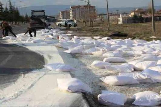 Ölen ya da yaralananın olmadığı kazanın ardından çevreye dağılan unların kaldırılması ile yoldaki trafik normal seyrine döndü.