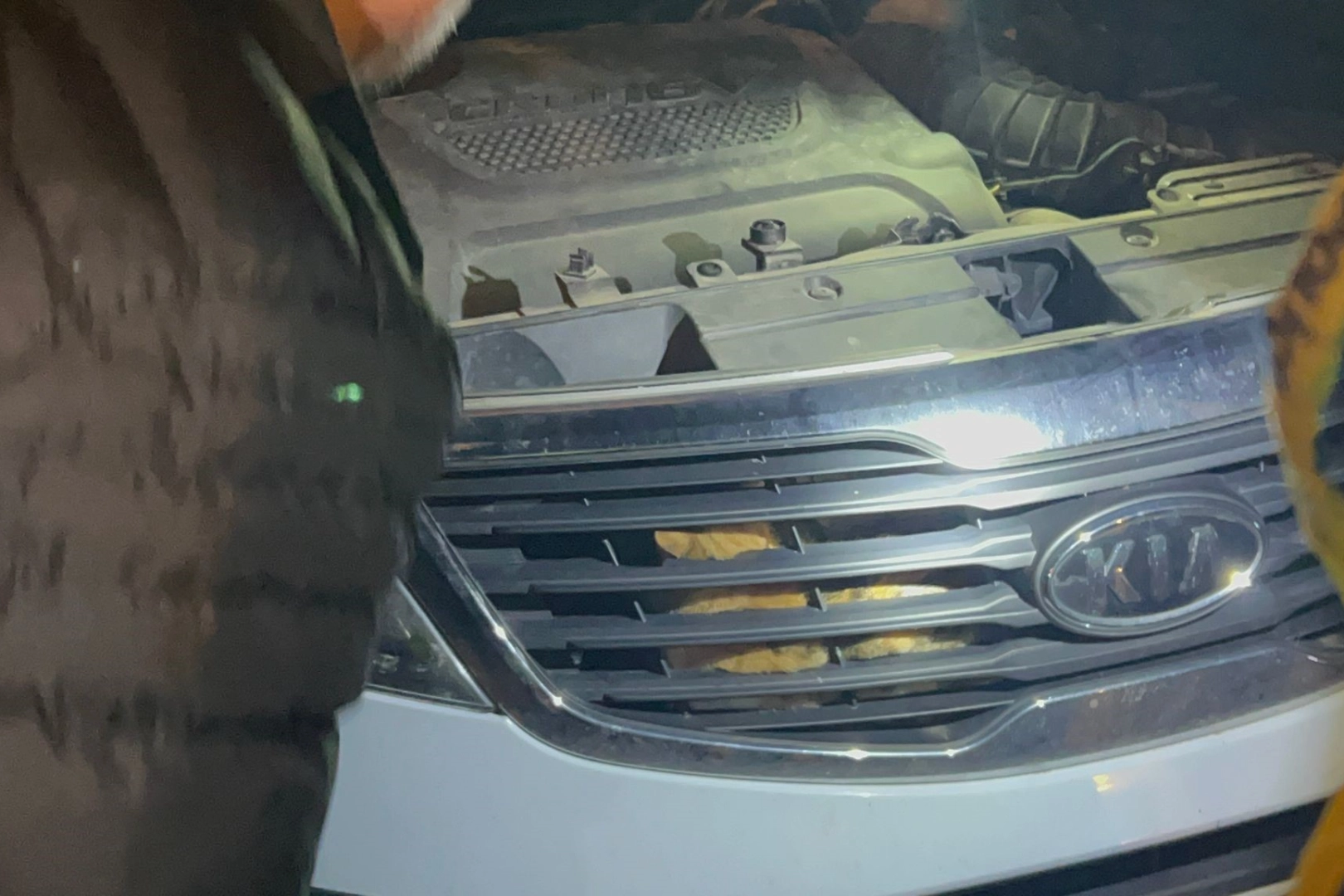 İnceleme sırasında aracın motor kısmından kedi sesi duyulunca ekipler, motor kısmında mahsur kalan kediyi uzun uğraşlar sonucu kurtardı.