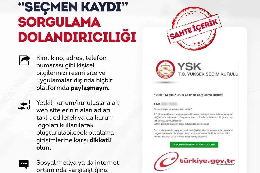 Adana Emniyet Müdürlüğü Siber Suçlarla Mücadele Şube Müdürlüğü, sosyal medya hesabı üzerinden seçimlere haftalar kala yeni bir dolandırıcılık yöntemine karşı vatandaşları uyardı. Polisin yaptığı uyarıda, vatandaşlara mail ve SMS yoluyla ulaşan dolandırıcıların Yüksek Seçim Kurulu'nun sitesini kullanarak dolandırıcılık yaptığı belirtildi. Polis uyarıda dolandırıcıların yöntemini şöyle anlattı: “Dolandırıcılar tarafından 'Yüksek Seçim Kurulu Seçmen Sorgulama Hizmeti' başlığıyla bir link gönderiliyor. Bu linkte üzerinden seçim kaydı sorgulaması yapılması isteniyor. Sorgulama yapmak isteyen vatandaşların adres ve telefon gibi iletişim bilgileri isteniyor. Kişisel bilgilerini dolandırıcıların sistemine giren vatandaşların cep telefonlarına mesaj geliyor. Burada vatandaş YSK’nın sitesine giriş yaptığını zannediyor ancak dolandırıcıların kurduğu sahte siteye giriş yapıyor. Bu sayede dolandırıcılar vatandaşın kişisel bilgilerine erişmiş oluyor.“ Polis, vatandaşların seçmen sorgulamasını sadece e-Devlet üzerinden yapması gerektiğini, başka mecralarda sorgulama yapmaması gerektiğini söyledi.