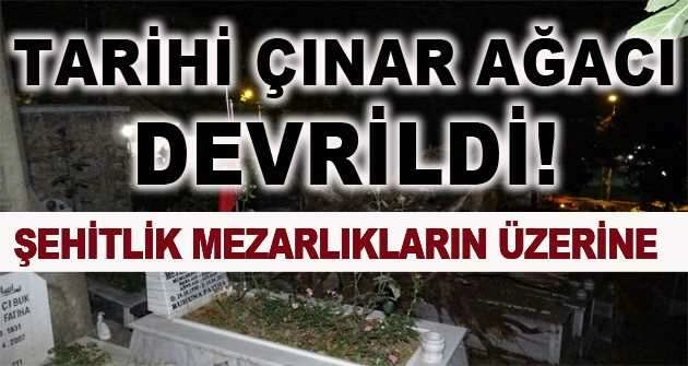 Olay, Bursa’nın Osmangazi ilçesine bağlı Pınarbaşı Mezarlığı Şehitliği’nde saat 21.30 sıralarında meydana geldi. Edinilen bilgiye göre akşam saatlerinde meydana gelen olayda yüksek bir gürültüyle tarihi çınar ağacı devrildi. Sesi duyan çevredeki vatandaşlar gelip baktıklarında durumu hemen polis ve itfaiye ekiplerine bildirdi. Olayın olduğu saatte şehitlikte kimsenin bulunmaması olası bir faciayı engellerken şehitlik’te toplam 10’a yakın mezarda hasar olduğu tespit edildi.