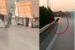 Anayolda ilerleyen bir kamyon sürücüsü, kamyonun tekerinin fırlamasıyla şoke oldu. Hemen aracı kenara çeken sürücü, eline aldığı suyla lastiklerin bulunduğu kısımda çıkan alevleri söndürmeye çalıştı.