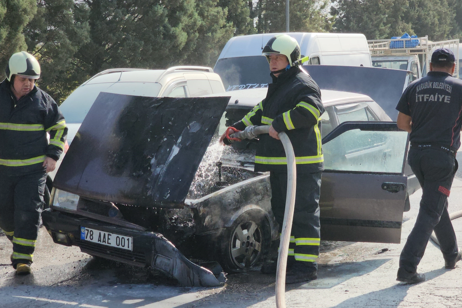Sürücüsünün kendisini dışarı atarak kurtulduğu yangına vatandaşlar su bidonları ve sürücü bezle müdahale ederken, yangın itfaiye ekiplerinin müdahalesi ile söndürüldü. Olay, Karabükköyü Mahallesi Ahmet Haşim Caddesi üzerinde meydana geldi. Karabük istikametine seyir halinde olan Sadık Ataşcan (65) idaresindeki 78 AAE 001 plakalı Tofaş marka otomobilin motor kısmından bir anda dumanlar yükselmeye başladı. Aracını yol ortasında durdurarak aşağıya inen sürücü Ataşcan, önce su bidonu, ardından ise bezle alevlere müdahale etmeye çalıştı. Buna rağmen bir anda alevlenen otomobile yoldan geçen diğer sürücülerin yangın tüpleri ile müdahalesi de yetersiz kaldı. İhbar üzerine olay yerine gelen Karabük Belediyesi itfaiye ekiplerinin müdahalesi ile otomobil demir yığınına dönmekten son anda kurtarılırken, büyük çapta maddi hasar oluştu. Çekici yardımı ile olay yerinden kaldırılan otomobilin sürücüsü Sadık Ataşcan, seyir halinde iken ne olduğunu anlamadığını ve bir anda aracın alev aldığını söyledi.
