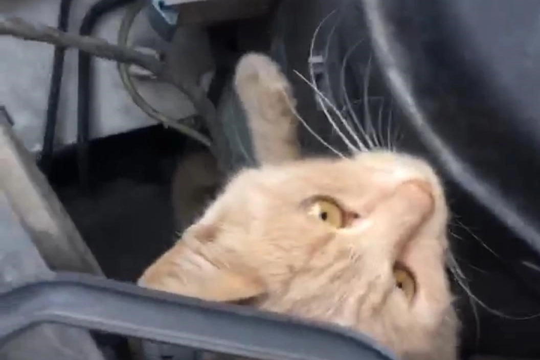Aracın kaputunu açtığında kediyle karşılaşan sürücü, şaşkınlık yaşarken, hemen kediyi oradan almak için kolları sıvadı.