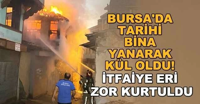 İtfaiye eri ise yanarak yıkılan binanın altında kalmaktan son anda kurtuldu. O anlar kameralara saniye saniye yansıdı. Yangın, 05.30 sıralarında merkez Osmangazi ilçesi Tavukçu sokakta meydana geldi. Edinilen bilgiye göre, hanlar bölgesinde bulunan yüzlerce yıllık tarihi 2 katlı binada henüz bilinmeyen bir sebepten ötürü yangın çıktı. Yangın kısa sürede büyüyerek binanın her tarafını sardı. Alevleri gören çevredeki vatandaşlar durumu itfaiye ve polis ekiplerine bildirdi. Olay yerine gelen polis ekipleri binanın yıkılma riskine karşı çevrede güvenlik önlemi alırken itfaiye ekipleri ise yangına müdahale etti. 2 katlı tarihi bina yangın sırasında çöktü. Yangın 1 saat süren söndürme çalışmalarının ardından tamamen kontrol altına alınırken yanında bulunan 14 Y.Y.'dan kalma tarihi cami ise şans eseri zarar görmedi. Yangının çıkış sebebi araştırılıyor. Öte yandan yangına müdahale eden bir itfaiye eri yanarak yıkılan tarihi binanın altında kalmaktan son anda kurtuldu.
