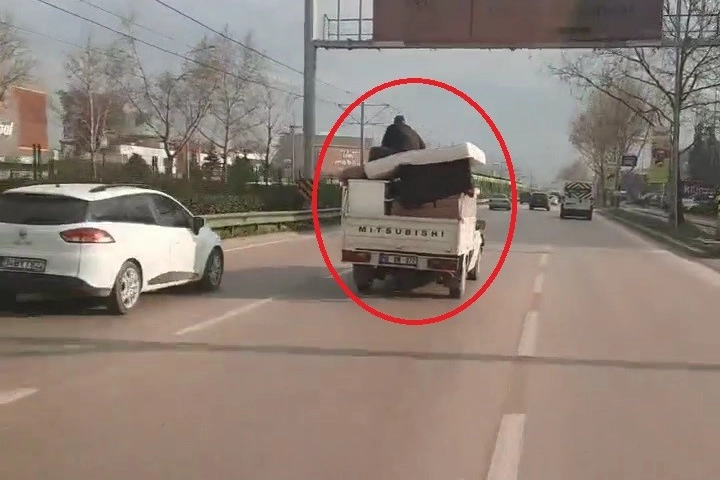 Merkez Osmangazi ilçesi Yeni Karaman Mudanya Caddesi üzerinde açık kasa kamyonet fazla yük yükledi. Yüklerin üzerinde bir kişinin kilometrelerce seyahat ettiğini gören diğer şoförler, korna ile ikaz etse de netice alamadı. Canını hiçe sayarak seyahat eden vatandaş, diğer sürücüler tarafından cep telefonu kamerasıyla kayda alındı.
