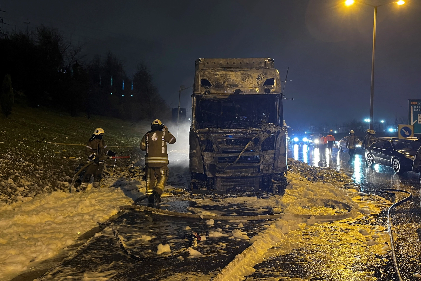 Esenyurt TEM Otoyolu'nda seyir halindeki tır alev alarak yandı. Yangın itfaiye ekiplerinin müdahalesiyle söndürülürken, alev topuna dönen tır cep telefonu kamerasına yansıdı. Olay, saat 21.30 sıralarında TEM Otoyolu Esenyurt mevkii Edirne istikametinde meydana geldi. Edinilen bilgilere göre, 34 GYS 384 plakalı Mustafa A. kontrolündeki böcek ilacı taşıyan tır, henüz bilinmeyen bir nedenle bir anda alev aldı. İhbar üzerine olay yerine polis ve itfaiye ekipleri sevk edildi. Alev topuna dönen araçta çıkan yangın itfaiye ekipleri müdahalesiyle kısa sürede söndürülürken, tır kullanılamaz hale geldi. Yangında ölen ya da yaralanan olmazken, TEM Otoyolu Edirne istikametinde trafik yoğunluğu oluştu. Öte yandan yangın çevrede bulunan vatandaşların cep telefonu kamerasına yansıdı.
