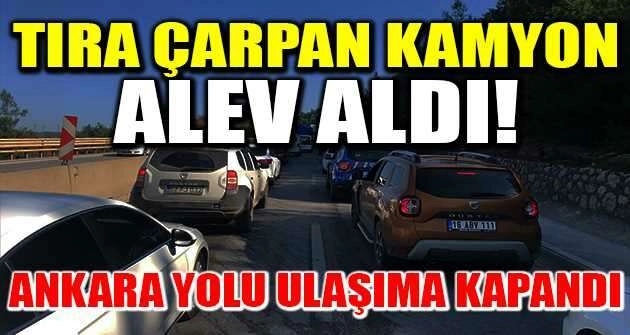 Bursa'da seyir halindeki tıra arkadan çarpan kamyon alev aldı. Bir anda alev topuna dönen kamyonda patlamalar meydana geldi. Bursa-Ankara karayolu trafiğe kapandı.