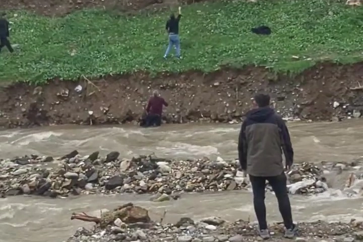 Dere kenarında yürürken sürüklenen çocuğu görüp dereye giren vatandaş, uzun süren mücadelenin ardından küçük çocuğu kıyıya çekebildi.