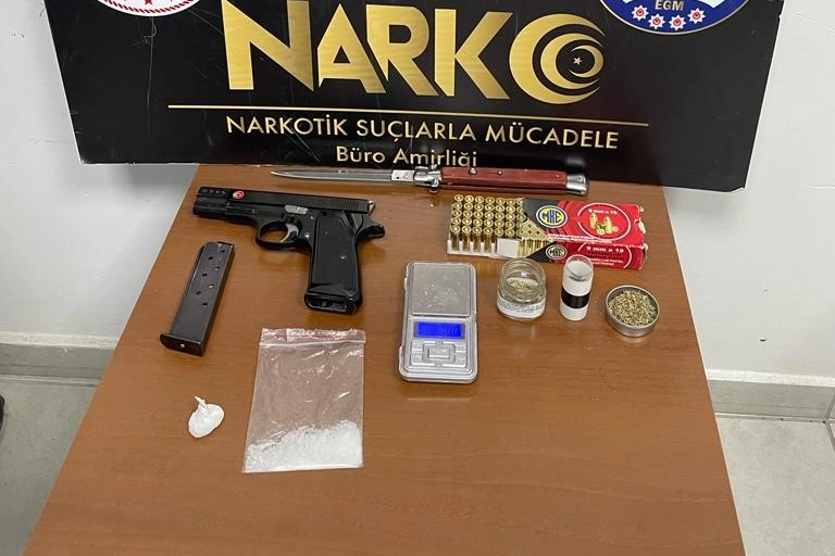 Gemlik Cumhuriyet Başsavcılığı talimatıyla Gemlik İlçe Emniyet Müdürlüğü Narkotik Suçlarla Büro Amirliği ekipleri harekete geçti. Gemlik ilçesi Umurbey Mahallesindeki A.P.'nin (43) evinin önünde bulunan araçta yapılan aramada, ruhsatsız tabanca, hassas terazi, sustalı bıçak, 6,20 gram sentetik kababinoid, 12,44 gram metanfetamin ele geçirildi. Gözaltına alınan zanlı A.P., çıkarıldığı mahkemece tutuklandı.