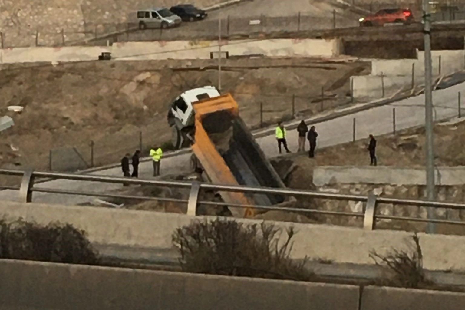 Olay, öğlen saatlerinde Mamak ilçesinde bulunan bir inşaat sahasında meydana geldi. Geri manevra yapan bir hafriyat kamyonu yoldan çıktı. Yol kenarında bulunan boşluğa düşen kamyon askıda kaldı. Düşen kamyonun kupası havada asılı kalırken olayda yaralanan olmadı.