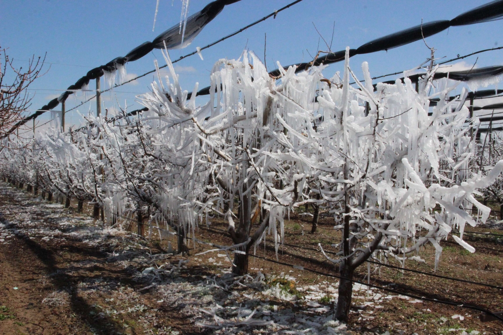 12 milyonun üzerindeki ağaç sayısı ile Türkiye’de birinci durumda olan Karaman, yılda ürettiği 500 bin ton elma ile de ikinci sırada yer alıyor. Modern elma bahçelerine sahip olan Karaman’da üreticiler son 2 gündür hava sıcaklığının sıfırın altında 5’lere kadar düşmesi üzerine bazı tedbirler aldı. Çoğu üretici ağaçların dondan etkilenmemesi için havadan ve yerden bahçelerini suladı. Sulama yapılan tüm bahçelerde ise ağaçların tamamen buz tutarak sarkıtlar oluşturması ortaya ilginç görüntüler oluşturdu. Sulandıktan sonra buz tutan elma ağaçları adeta buzulları hatırlattı. “Korkutucu bir durum yok” Buz tutan elma bahçelerinde incelemelerde bulunan Karaman Ziraat Odası Yönetim Kurulu Başkanı Mehmet Bayram, elmanın başkenti Karaman’da son 2 gündür ciddi soğukların yaşandığını söyledi. Bayram, elmalarda pembe gonca dönemi olmadığı için herhangi bir soğuk vurma olayının olmadığını belirterek, “Dona karşıda tedbir olarak üreticilerimiz bugünlerde hem bahçelerindeki pervaneleri hem de sulama sistemlerini çalıştırıyor. Karaman’da yaşanan bu görüntüler korkutsa da elmayla ilgili bir hasar söz konusu değildir. Sulama yapılan bahçeler de ağaçların buz tutması adeta buzulları anımsatmış. Ancak kayısı ve bademde yüzde 100’e yakın bir hasarın olduğunu görüyoruz. Bahçelerin sulanma amacı ağaçların çiçek döneminde dondan etkilenmemesi için sertleşen havanın suyla yumuşatılması için yapılan bir önlemdir. Yapılan bu önlemle ağaçlar kendilerini korumaya almış oluyor" dedi. Karaman bölgesinde Nisan ayında don riski bulunduğunu kaydeden Bayram, “Üreticilerimiz de bunun için her yıl önlem alıyor. Bugün burada gördüğümüz manzaraysa korkutucu gibi görünse de normal bir durumdur" diye konuştu. Bahçe sahibi Ramazan Mercik Kızıldeniz ise, “Bahçemizdeki ağaçların tamamen buz tutması, bizim ağaçlarımızı koruduğumuz anlamına geliyor. Şu an için bahçemizde bir sıkıntı yok. Görüntü korkutucu gibi dursa da biz üreticiler için faydalı bir görüntü “dedi.