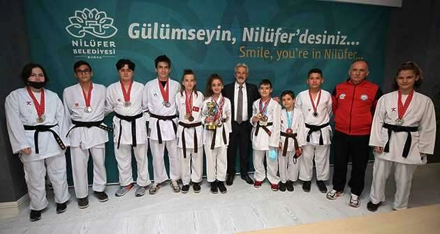 Nilüfer Belediyespor ile kentte sporun farklı branşlarını her yaştan insanla buluşturan, ülke sporuna başarılı sporcular kazandıran Nilüfer Belediyesi, bunun karşılığını lig ve şampiyonalarda elde edilen başarılarla alıyor. Nilüfer Belediyespor Karate Takımı da, 23-24 Ekim tarihlerinde Denizli’nin Sarayköy ilçesinde gerçekleştirilen Yenal Karahan Karate Ligi Final Etabı’na başarısıyla damga vurdu. İlhan Çakır’ın antrenörlüğünü yaptığı Nilüfer Belediyespor Karate Takımı, şehre 11 madalya ve iki kupa alarak döndü. Nisanur Çakır, Melis Güngördü ile Mürsel Ünal’ın şampiyonluk elde ettiği karate liginde, Barış Çolak, Esedullah Bayır, Atalay Terik, Fulya Uzunsoy ve Ahmet Alper Aydın da ikincilik kürsüsüne çıktı. Ömer Seyit Çakır, Yusuf Avcı ve Fatma Güngördü’nün üçüncülük sevinci yaşadığı lig etabında, Nilüfer Belediyespor, Yıldız Kızlar kategorisinde birinci, Ümit Erkekler kategorisinde de ikinci oldu. Ayrıca takım kumite kızlarda Nisanur Çakır, Melis Güngördü ve Fulya Uzunsoy birinci, takım kumite erkeklerde de Ömer Seyit Çakır, Barış Çolak ve Muhammet Samet Babacan da ikinci oldu. Nilüfer Belediyespor Karate Takımı antrenörü ve sporcuları, Nilüfer Belediye Başkanı Turgay Erdem’i makamında ziyaret ederek sevinçlerini paylaştı. Teknik heyet ve sporcuları başarılarından dolayı kutlayan Başkan Turgay Erdem, “Nilüfer Belediyespor’un adını Türkiye’de başarıyla duyuruyorsunuz. Başarı çıtasını her geçen gün yukarılara çıkaracağınıza inanıyorum. Çalışmalarınızda başarılar diliyorum” dedi. Başkan Turgay Erdem, antrenör ve sporculara hediyeler takdim etti.