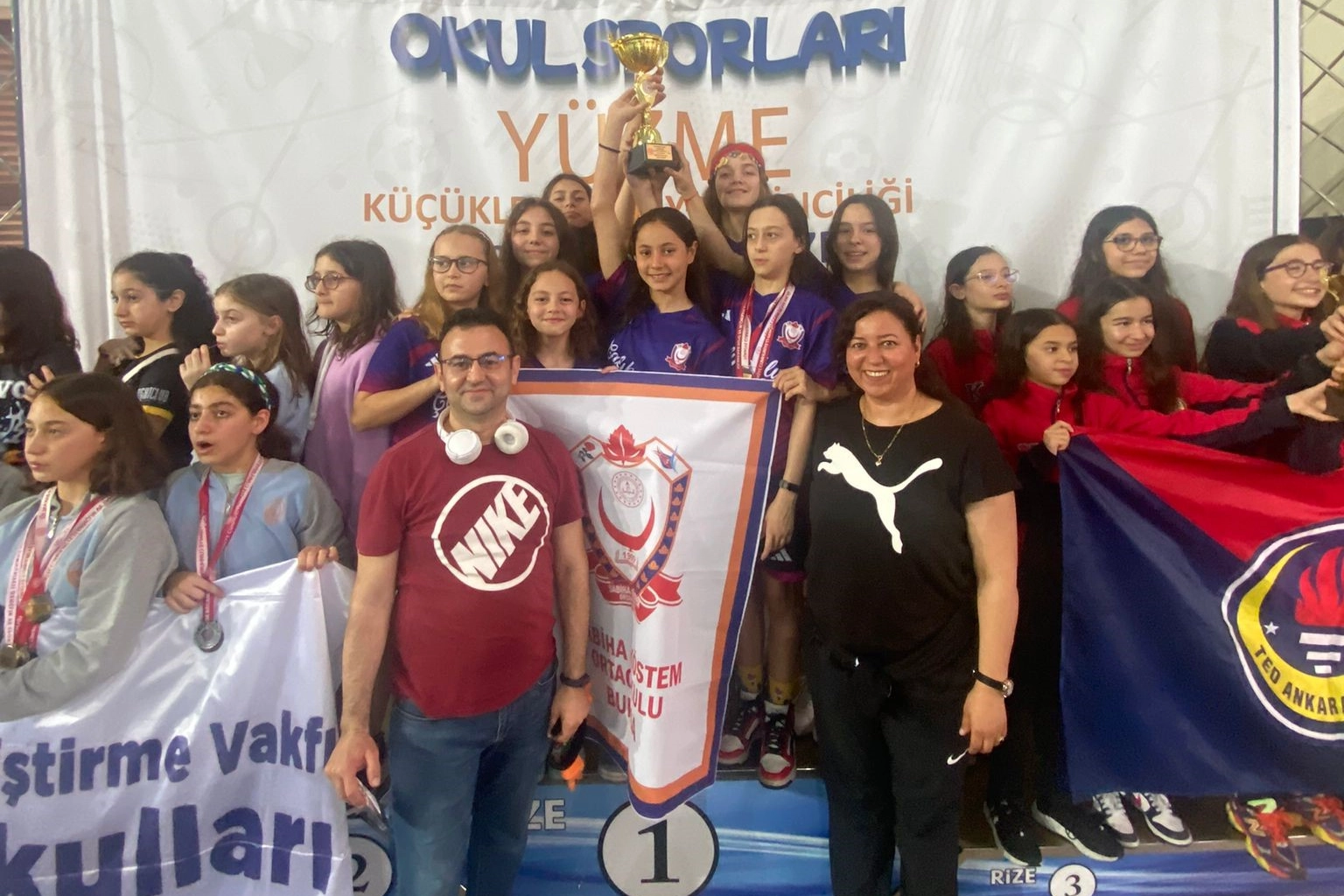 Bursa Osmangazi Sabiha Köstem Ortaokulu yüzme takımı Rize’de gerçekleştirilen Okul Sporları Küçükler Yüzme Türkiye Şampiyonası’nda tarihi bir başarıya ulaşarak Türkiye şampiyonu oldu. Geçtiğimiz yıllarda Futbol Türkiye 4.'lüğü, Voleybol Türkiye 3.’lüğü, Atletizm Türkiye 2.’liği başarısı olan Sabiha Köstem Ortaokulu, bu yıl Yüzme Türkiye Şampiyonluğu ile yıllardır süregelen başarısını taçlandırdı. Her yıl yüzlerce öğrencisini Fen Lisesi, Anadolu Lisesi ve nitelikli liselere gönderen ve bu yönüyle akademik başarısını ispatlayan okul, spor dallarında da hatırı sayılır başarılarına bir yenisini daha ekledi. Kıyasıya rekabetin yaşandığı şampiyonada sergiledikleri üstün performansla bu önemli başarıya imza atan öğrencilerini tebrik eden Okul Müdürü Muhsin Şahin, “Sabiha Köstem Hayallerin Gerçekleştiği Okul" sloganıyla çıktığımız bu yolda okul yönetimi olarak spora gönül vermiş öğrencilerimizi her zaman destekliyor ve onların yanında oluyoruz. Rize’de şampiyon olan öğrencilerimizi kutluyorum. Onların her zaman yanında olan öğretmenlerimiz Ayşe Gökçe’ye ve İsmet Vatansever’e teşekkür ediyorum. Yıl boyunca futbol, voleybol, basketbol, futsal, atletizm, bocce, satranç ve bireysel spor dallarında sayısız kupa kazanan bütün takımlarımızın oyuncularını ve değerli öğretmenlerimizi gönülden tebrik ediyorum. Spordaki bu üstün başarıların yıl sonundaki LGS başarısı ile zirveye çıkacağına inanıyorum. Öğrencilerimizi hem akademik hem de sosyal ve sportif faaliyetler ile geleceğe hazırlamanın en temel hedefimiz olduğunu belirtmek istiyorum. Başarılarımız daim olsun” dedi.