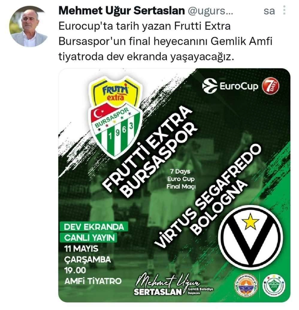 Belediyenin sosyal medya hesaplarından yapılan duyuruda, 11 Mayıs Çarşamba, saat 19.00'da, Gemlik Amfitiyatro'da bu önemli maçın yayınlanacağı belirtildi. Gemlik Belediye Başkanı Mehmet Uğur Sertaslan, "Eurocup'ta tarih yazan Frutti Extra Bursaspor'un final heyecanını Gemlik amfi tiyatroda dev ekranda yaşayacağız" diyerek, tüm Gemliklileri dev ekranda maç keyfine davet etti.