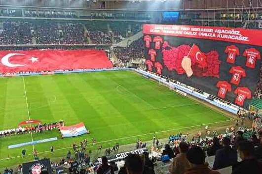 2024 Avrupa Şampiyonası Elemeleri D Grubu ikinci maçında A Milli Futbol Takımı, Hırvatistan'ı konuk ediyor. Bursa Büyükşehir Stadyumu kale arkası tribünde açılan koreografi depremden etkilenen illerin plaka kodlarının olduğu formalar yer aldı. Ayrıca koreografi de, "Zorlukları hep beraber aşacağız. Güzel yarınları omuz omuza kuracağız" ifadeleri kullanıldı.