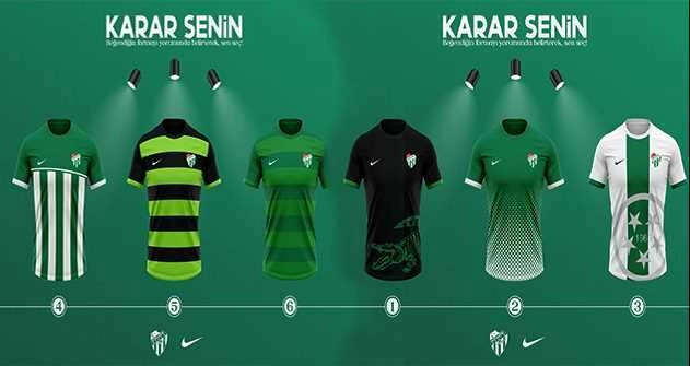 Bursaspor, forma sponsoru olan tedarikçi firmanın yeni formalarını camia ile paylaştı. Yeşil-beyazlı kulüp, firma tarafından gönderilen 6 forma seçeneğini 4’e indirmek için sosyal medya hesabından anket oluşturdu ve taraftarından yardım istedi.