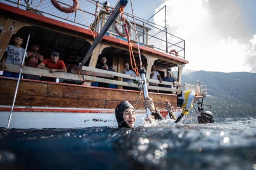Deprem bölgesi Hatay'da dalış yapan Ercümen, paletsiz değişken ağırlık kategorisinde 105 metre rekorunu kırmayı başardı.