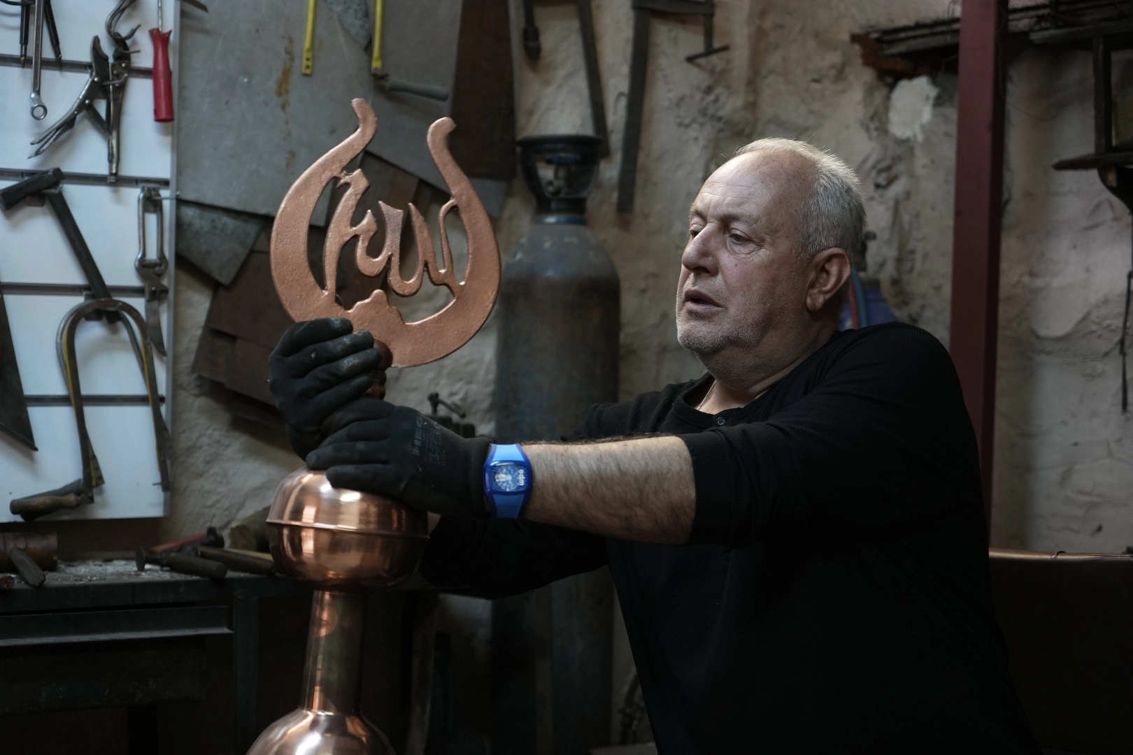 Bursa’da 60 yaşındaki Rıza Akbalış 3 kuşaktır devam eden 120 yıllık aile mesleğini, ilk günkü heyecanıyla devam ettiriyor. Abdal Mahallesi’nde bulunan atölyesinde babasından kalan aletlerle 14 yaşından bu yana zanaatına devam eden Akbalış, Türkiye’de birçok tarihi caminin alemini onarırken yurt dışına da sipariş üzerine ihracat yapıyor. Genellikle Balkan ülkelerinden çok fazla talep olduğunu dile getiren Akbalış, bu güne kadar Balkan ülkeleri başta olmak üzere dünyanın birçok ülkesine alem yaptığını söylüyor. Türkiye’de sadece 4 tane alem ustası kaldığını belirten Akbalış, kendisinden sonra bu mesleği devam ettirecek kimsesi kalmadığını kaydetti.