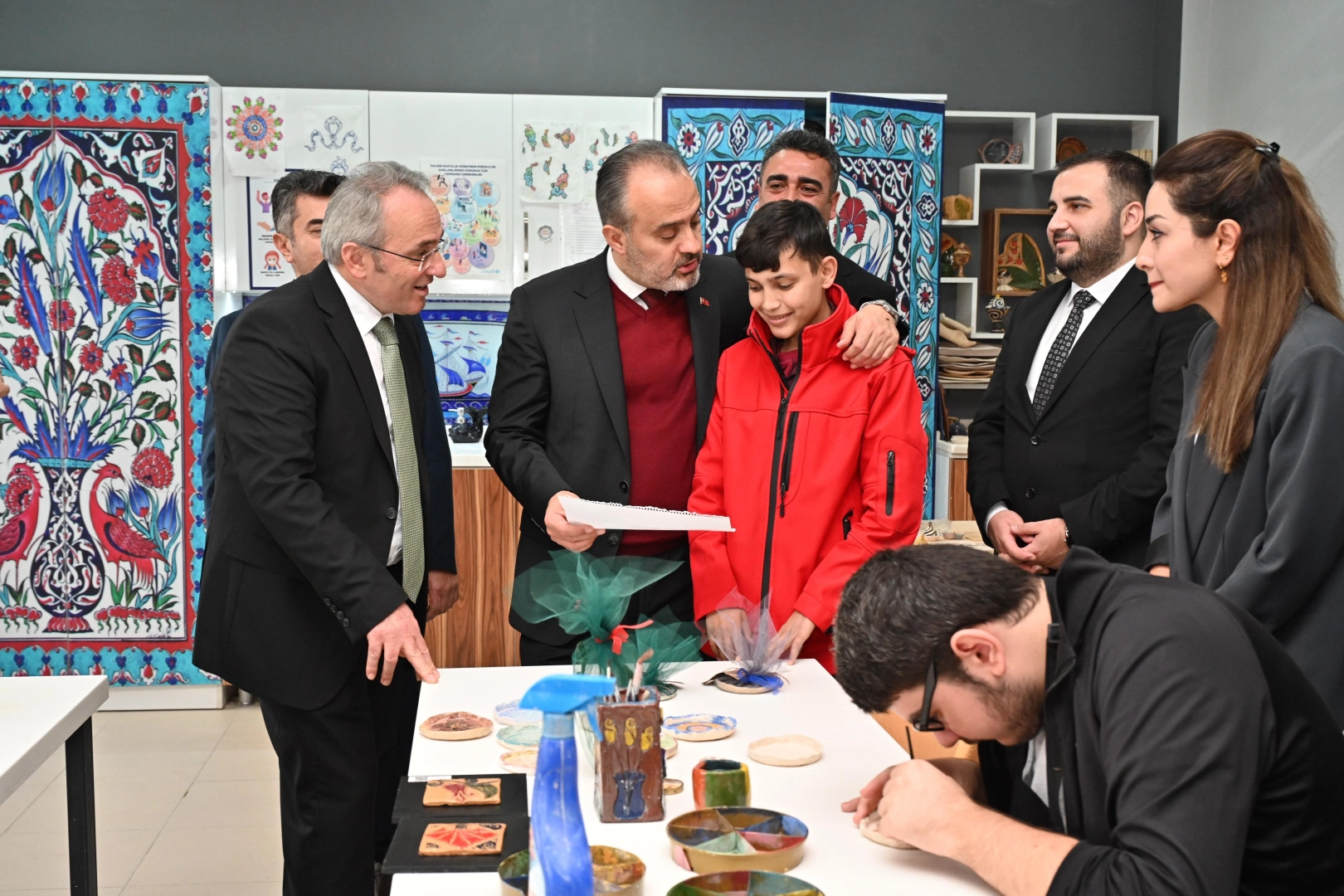 Yoğun temposuna rağmen, fırsat buldukça eğitim kurumlarını ziyaret edip, gençlerle tecrübelerini paylaşan Bursa Büyükşehir Belediye Başkanı Alinur Aktaş, 3 Aralık Dünya Engelliler Günü etkinlikleri çerçevesinde bu kez Mehmet Torun Aziz Torun Özel Eğitim Uygulama Okulu’nda eğitim gören özel öğrencilerle buluştu. İl Milli Eğitim Müdürü Dr. Ahmet Alireisoğlu ve Osmangazi İlçe Milli Eğitim Müdürü Metin Sezer ve Okul Müdürü Mesut Güzel ile birlikte dokuma, el sanatları ve seramik atölyelerinde çalışan özel öğrencileri ziyaret eden Başkan Aktaş, öğrencilerle sohbet edip, onlara başarılar diledi.,