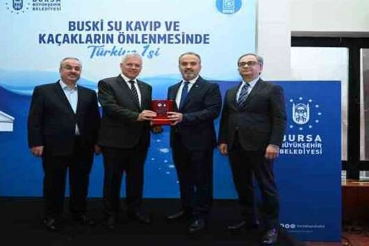 Başkan Aktaş, törenin sonunda Bursa'nın altyapısına değer katan gayretli çalışmaları nedeniyle tüm BUSKİ çalışanları adına BUSKİ Genel Müdürü Güngör Gülenç'e teşekkür plaketi verdi.