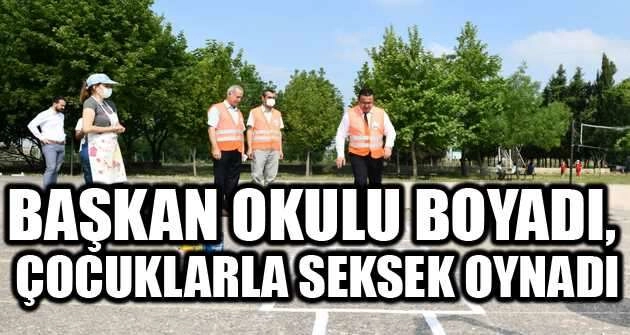 Mustafakemalpaşa Belediye Başkanı Mehmet Kanar, çocuklara sürpriz yaparak birlikte okulun duvarlarını boyadı. Seksek oynayan Kanar, çocuklara tatlı ikram etti.