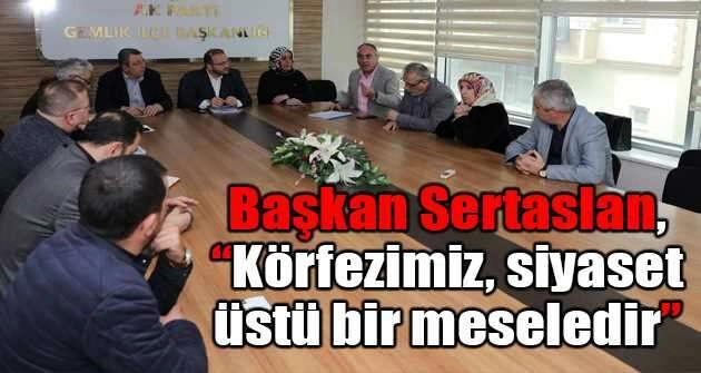 “Körfezimiz bu yükü kaldırmıyor” Gemlik Körfezi’nin artık bu yükü kaldıramayacak hale geldiğini ifade ederken, körfeze su dolu kova benzetmesi yapan Başkan Sertaslan, “Gemlik Körfezi Türkiye’de kendini en zor temizleyen iç denizlerden, yıllardan beri gerek hava sıcaklığındaki değişim gerekse insan kaynaklı kirlenmeyle Türkiye’de müsilajın en etkili olduğu bölgelerin başında geliyor. 1970’li yıllarda temizliğiyle ünlü körfezimiz artık bu yükü kaldırmıyor. Sanayi bölgemizde faaliyet gösteren kimya fabrikası yapacağı derin deniz deşarjıyla körfezimizden Gemliklilerin bir günde kullandığı suyun yedi katı olan saatte 5500 metreküp su alacak mevsimine göre kendi iddiasıyla biraz ısıtarak denizimize geri bırakacak. Bu deniz yaşamı için tehlikelidir. Bütün çabamız bizim yüzdüğümüz denizimizde torunlarımızın da yüzebilmesi içindir” dedi.