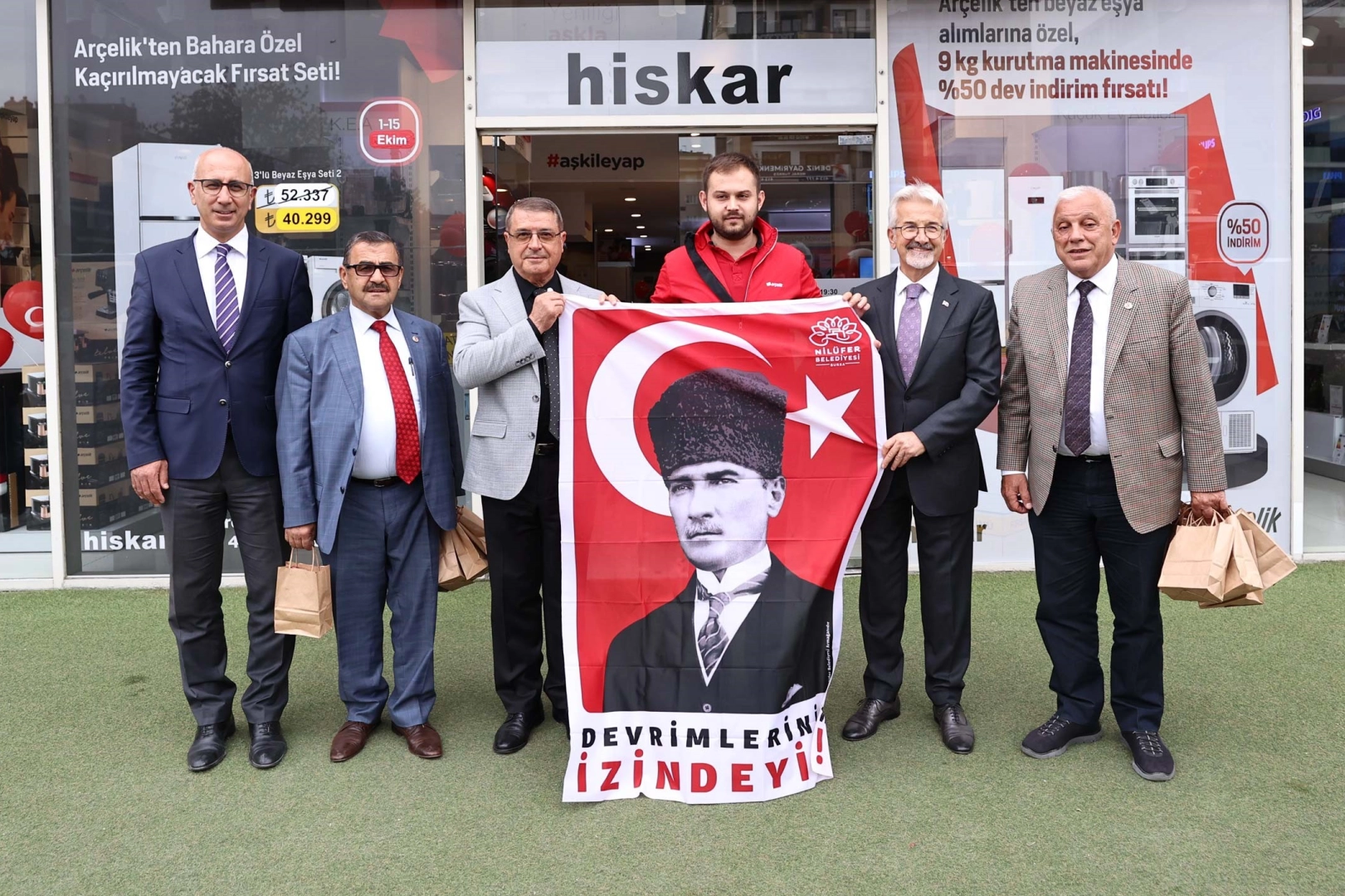 Nilüfer Belediye Başkanı Turgay Erdem, BESOB Başkanı Fahrettin Bilgit ve yönetimiyle birlikte Ahmet Taner Kışlalı Bulvarı’nda esnafı ziyaret ederek, evlerine ve işyerlerine asmaları için esnafa Atatürk posteri ve Türk bayrağı armağan etti. Başkan Erdem, esnafı Cumhuriyet’in 100. yılını coşkuyla kutlamak için FSM’deki yürüyüşe davet etti.