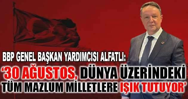 Tarih boyunca Türklerin asla esir edilemediğini ve kıyamete kadar da edilemeyeceğinin altını çizen Alfatlı şunları söyledi: “Anadolu topraklarının Türk Milleti’ne vatan olduğu Malazgirt Zaferi’ni kazandığımız tarihin yıl dönümünde, 26 Ağustos günü başlayıp, 30 Ağustos 1922 günü zaferle sonuçlanan Büyük Taarruz’un 99.yılını, Nizam-ı Alem ve İ’la-yı Kelimetullah davasının şanlı sancaktarı milletimizle bir ve beraber olarak , gururla kutluyoruz. 30 Ağustos tarihi, şartlar ne kadar zorlu olursa olsun, imkanlar ne kadar kısıtlı olursa olsun, esir edilemeyeceğimizin, vatanımızı teslim etmeyeceğimizin, Türk Milleti’nin hür ve bağımsız yaşama iradesinin yok edilemeyeceğinin abidevi bir ifadesi olarak, bugün karşı karşıya olduğumuz meselelere, gelecek nesillere ve dünya üzerindeki tüm mazlum milletlere ışık tutuyor.Bu irade ,azim ,karalılık ve büyük fedakarlıklarla İşgalci Emperyalist güçlere karşı Büyük Türk Milleti Zafer kazandı ise ,bu kararlılığı gösterecek uluslarda Emperyalizmin boyunduruğundan kendilerini kurtarabileceklerdir .Bu Zafer tüm dünyaya bunu göstermiş ve öğretmiştir . Sultan Alparslan’dan Gazi Mustafa Kemal Atatürk’e, bu toprakları bize vatan yapan, İstiklal Savaşı’mızı kazanarak, ay yıldızlı al bayrağın altında hür ve bağımsız yaşamamızı sağlayan milletimizin kahraman evlatlarını, şehitlerimizi, gazilerimizi rahmet ve minnetle anıyorum. İçinde bulunduğumuz Zaferler Ayı’nın, çembere alınmaya, yok edilmeye çalışılan ,Türk İslam coğrafyası ve milletimiz için, yeni ve mutlak zaferlere vesilesi olmasını diliyorum. 30 Ağustos Zafer Bayramımız kutlu olsun.”