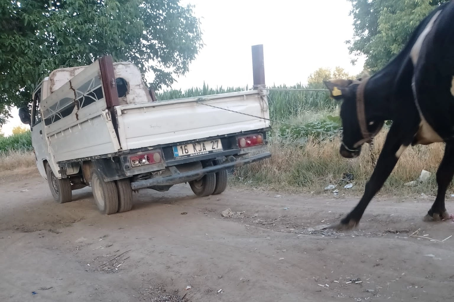 Olay, İnegöl’ün kırsal bir mahallesinde meydana geldi. Görüntülerde, kamyonetin arkasına bağlanan büyükbaş hayvanın yürümekte zorlandığı, ardından yere yığıldığı ve sürücü tarafından defalarca sopayla vurularak ayağa kalkmaya zorlandığı görülüyor.