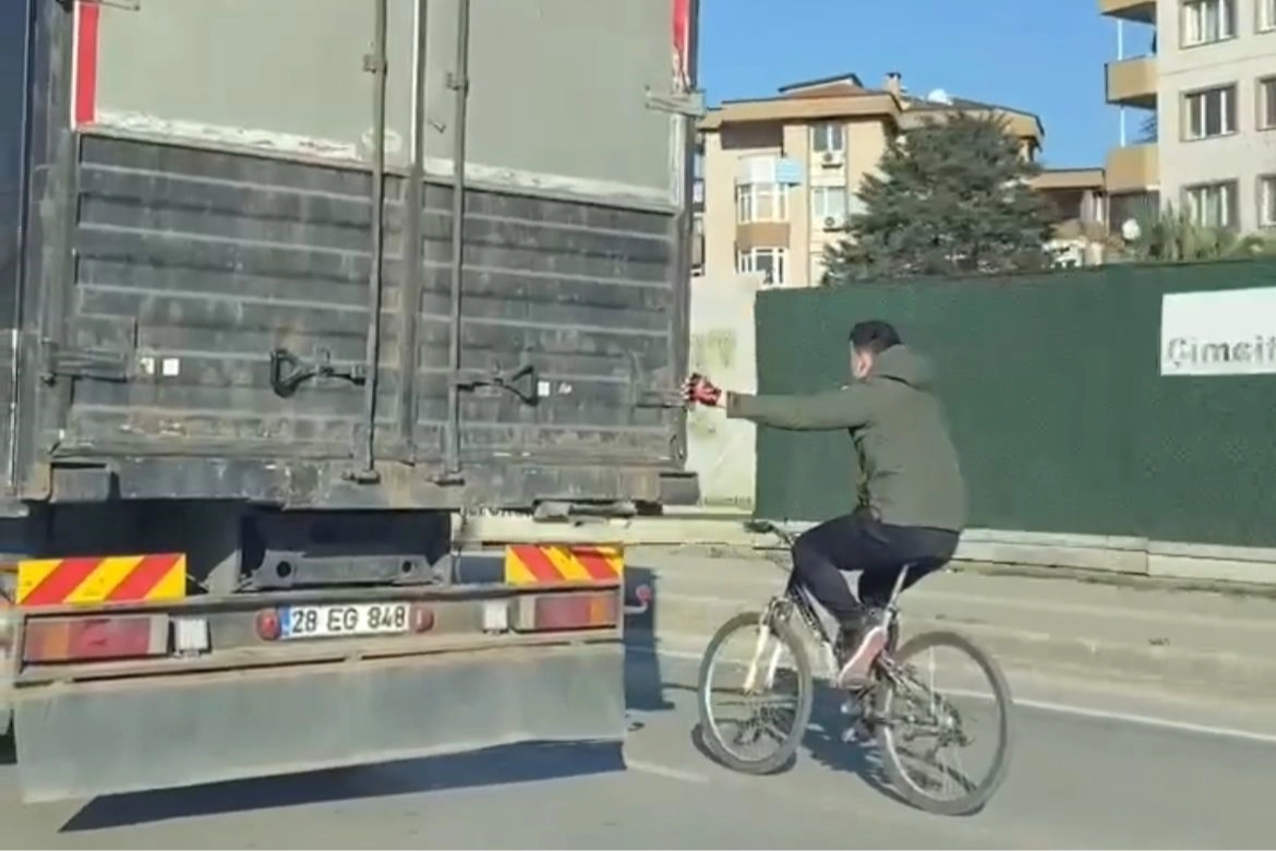İzmir Yolu - Orhaneli Kavşağında ilerleyen bir bisikletli genç, çevirdiği pedallardan sıkılınca kamyonun kasasına doğru yanaştı. Kamyonun kasasına tutunan genç, enerjisinden tasarruf ettiğini düşünerek, yolun keyfini çıkardı. Kamyonun kasasına tutunarak giden bisikletliyi gören vatandaşlar ise cep telefonu kameralarına sarıldı. Trafiğin yoğun olduğu saatlerde ana yolda seyir halinde olan kamyonun arkasında bisikletiyle ilerleyen genç, adeta canını hiçe sayarak kazaya davetiye çıkardı. Bu şekilde kilometrelerce giden bisikletinin tehlikeli yolculuğu ise vatandaşların cep telefonu kameralarına saniye saniye yansıdı.