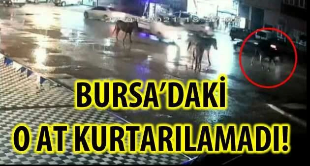 Araçtaki 3 kişi ölümden dönerken, yaralı at için herkes seferber oldu. Kazada yaralanan at telef olurken, kazaya ait kamera görüntüleri ortaya çıktı. Kozluca yolunda Ufuk D. idaresindeki kamyonet, bir anda yola çıkan başı boş ata çarptı. Kamyonetteki 3 kişi ölümden dönerken başıboş at ise yaralandı. Olay yerine gelen trafik ekipleri önlem alarak ata başka arabaların çarpmasın önüne geçti. Yaralı at olayına gelen İnegöl Belediyesi hayvan barınağı ekipleri tarafından yapılan kontroller sırasında yol kenarına alındı. Yolda geçen bir kadın gördüğü manzara karşısında gözyaşlarına hakim olamadı. Havanın yağmurlu olması sebebiyle yaralı atın üzerine yolda bulunan torba örtüldü. Yoldan geçenler de meraklı bir şekilde gelip atı kontrol etti. Trafik polisi başını okşadığı yaralı atı sakinleştirmeye çalıştı Olay yerindeki trafik polisi de atın başını okşayarak yaralı atı sakinleştirmeye çalıştı. Uzun bir bekleyişin ardından yaralı at olayına gelen kepçeyle kaldırılarak hayvan barınağına götürüldü. Burada tedavi altına alınan yaralı at telef oldu. Ata kamyonetin çarpma anı ise saniye saniye güvenlik kamerası görüntülerine yansıdı. Kaza yapan sürücü, atın birden önüne çıktığını söyledi. Ata çarptığı için üzgün olduğunu söyleyen sürücü, “Gördüğüm manzara karşısında üzülmemek elde değil” dedi.