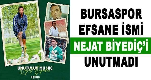 Bursaspor Kulübü’ne büyük katkıları olan hem futbolculuk hem de teknik adamlık görevleri üstlenen Nejat Biyediç, vefatının 10. yılında da saygı ile anıldı. Bursaspor Kulübü’nden yayımlanan mesajda şu ifadelere yer verildi: "Kulübümüzde hem futbolcu hem de teknik direktör olarak görev yapan 'İmparator' Nejat Biyediç'i vefatının 10. yılında saygı, sevgi ve özlemle anıyoruz."