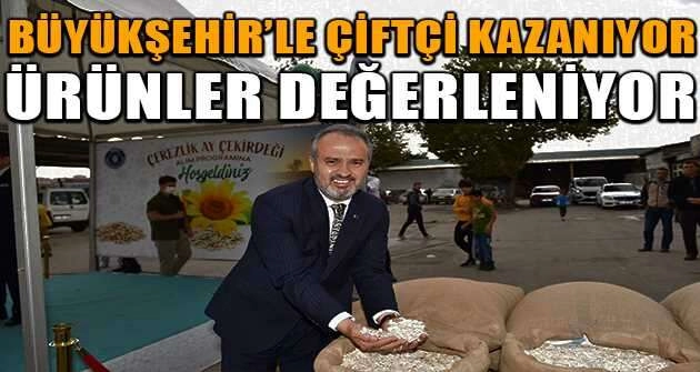 Bursa Büyükşehir Belediyesi’nin kırsalda kalkınmayı sağlamak ve çiftçinin zarar etmesini önlemek maksadıyla yürüttüğü ‘çerezlik ay çekirdeği’ alım programı törenle başladı. Büyükşehir Belediye Başkanı Alinur Aktaş, ürünü kaliteli yetiştirmek kadar plânlı üretimin ve doğru pazarlamanın da önemli olduğunu söyledi.