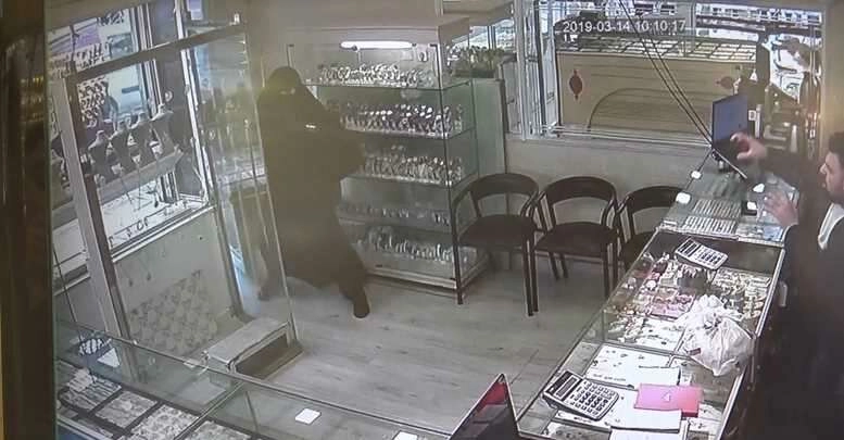 Bursa'da çarşaf giyerek kuyumcuya giren pompalı tüfekli erkek soyguncu, dükkan sahibinin tezgahın üzerindeki bant kesiciyi fırlatmasıyla kaçtı. Olay, iş yerinin güvenlik kamerasına yansıdı.