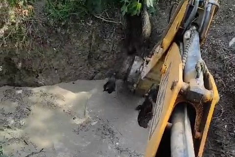 İş makinesinin desteği ile su dolu havuzdan çıkarılan domuzlar yaban hayatına geri döndü.