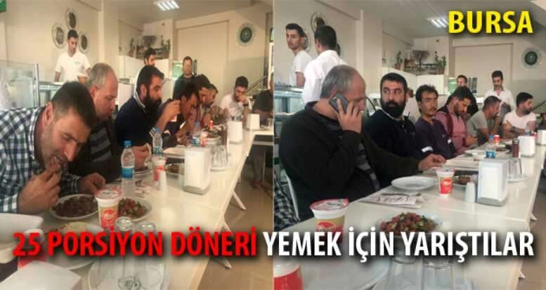 Yarışmacılar 25 porsiyon döner yemek için çalıştı. Birinci olan kişi 15 porsiyonda kalmasına rağmen; işyeri sahibi finali göğüsleyen bu yarışmacıyı ödüllendirdi. Nilüfer'in Üçevler Mahallesi'nde faaliyet gösteren Dönerci Abdullah Usta, müşterilerinin talebi üzerine döner yeme yarışması düzenledi. İş yeri sahibi 25 porsiyon döner yiyene Cumhuriyet altını verileceğini açıkladı. 11 kişinin katıldığı yarışmada yarışmacılar 45 dakika içerisinde 2.5 kilo eti yemek için yarıştı. Yarışma esnasında süre 40 dakika daha uzatıldı. Eğlenceli anların yaşandığı yarışmaya katılanlar 400 gram ile 1.5 kilo arasında döner yedi. Yarışmanın birincisi Özer Taş, ikincisi ise Sedat Ceylan oldu. Yarışmada birinci olan Özer Taş, “Daha önce 2 kilo civarında yediğim olmuştu. Bugün biraz midem rahatsızdı, ama ona rağmen 15 porsiyon yedim. Birinci olmak güzeldi. Abdullah Usta’nın döneri çok güzel. Herkese tavsiye ederim” dedi. Yarışmanın ikincisi Sedat Ceylan ise, diyette olmasına rağmen yarışmaya katıldığını ifade ederek, “Daha önce hiç bu kadar et yememiştim. Abdullah Usta’nın döneri çok güzel. Eğlenceli bir yarışma oldu. Bir daha daha iddialı hazırlanacağım” diye konuştu. Dönerci Abdullah Yavuz ise, “Müşterilerimizden gelen talep üzerine böyle bir yarışma tertip ettik. Gerçekten çok keyifli oldu. Bu yarışmada cumhuriyet altınını vaad ettik. Bundan sonraki yarışmalarda çok sürprizlerimiz olacak. İnşallah bir dahakine daha çok finalist olur” şeklinde konuştu. Dönerci Abdullah Yavuz, yarışma şartlarını yerine getiremese de birinci olan yarışmacıyı altınla ödüllendirdi.