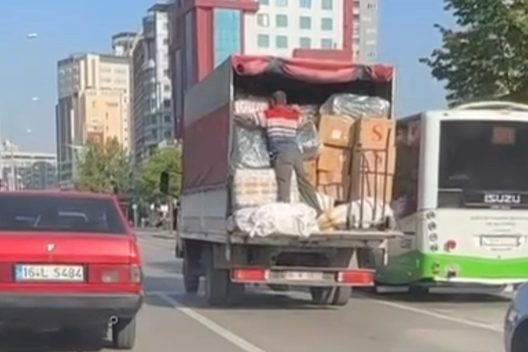 Bursa'da evden eve tehlikeli taşımacılık kameraya yansıdı. Merkez Osmangazi ilçesi Haşim İşçan Caddesi üzerinde evden eve eşya taşıyan kamyonet yürekleri ağza getirdi. Kamyonetin kasasında eşyaları tutan vatandaşı gören sürücüler gözlerine inanamadı. Bir süre tehlikeli şekilde giden kamyonet ara sokaklara girerek gözden kayboldu. Kameralara yansıyan görüntülerde vatandaşın eşyalar düşmesin diye vücudunu siper etmesi ise hafızalara kazındı.