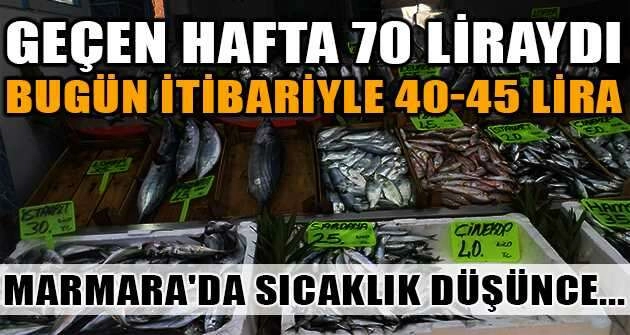 Marmara Denizinde hava sıcaklıklarının düşmesiyle birlikte pazar tezgahlarındaki balık fiyatları ucuzladı. Geçen hafta 70 liradan alıcı bulan lüfer balığı bugün itibariyle 40-45 lira arasında alıcı buluyor.