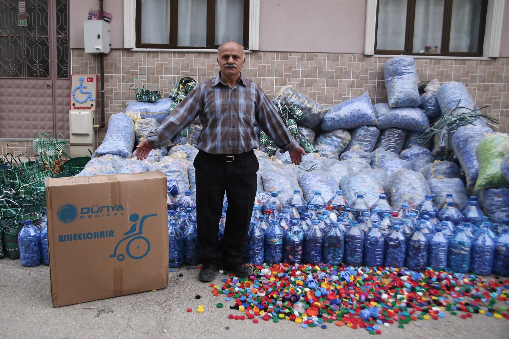Hayatını hayır işlerine adayan Gökçe, “2010 yılında emekli oldum. 2011 yılından bu yana kapak topluyorum. Engellilere yardım ederek başladım. Bir yandan kapak topladım. Tonlarca atığı geri dönüşüme kazandırdım. Topladığım kapaklarla tekerlekli sandalye aldım. Burada 1 milyondan fazla kapak var, ağırlık olarak 1 ton civarında. Bu kapakları 2 senede topladım. Daha önceki yıllarda 1 milyon kapağı 3 yılda toplamıştım. Bu güne kadar toplam 6 ila 7 milyon arası kapak topladım. Hep tek başıma mücadele ettim. Bazen 20 kilometre gidip geldiğim günler oldu. Kapakları geri dönüşümcülere satıyorum. Elde ettiğim parayla tekerlekli sandalye alıyorum. Birazını da kendi cebimden veriyorum. Bu güne kadar 4 tekerlekli sandalye aldım. Engellilere yardım amaçlı aldığım için bana indirim de yapıyorlar. Elimden geldiğimce herkese yardım ediyorum” şeklinde konuştu.