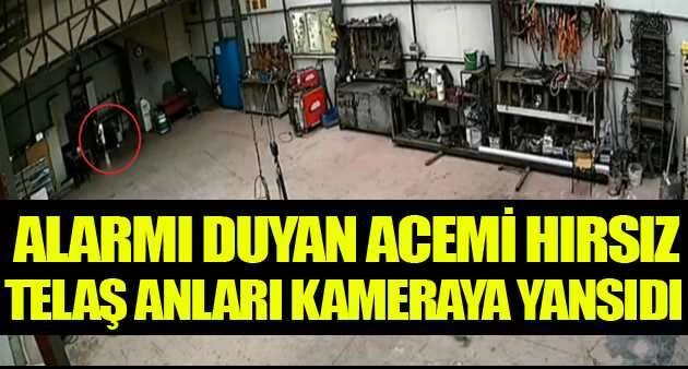 Bursa’da hırsızlık için girdiği demirci dükkanında alarm çalınca nereye kaçacağını şaşıran hırsızın telaş anları işyeri kamerasına anbean yansıdı.