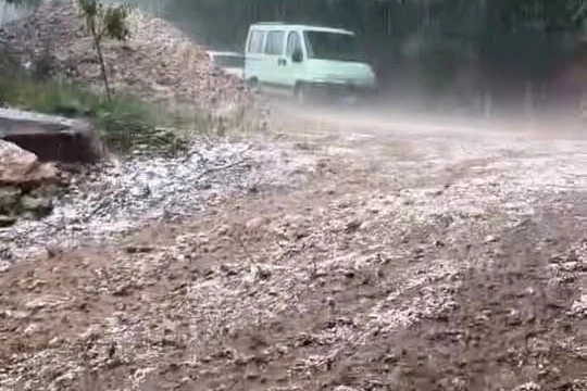 İnegöl Mezit Boğazı mevkiinde aniden bastıran sağanak yağış yerini doluya çevirdi. O anlar amatör kameraya yansıdı.