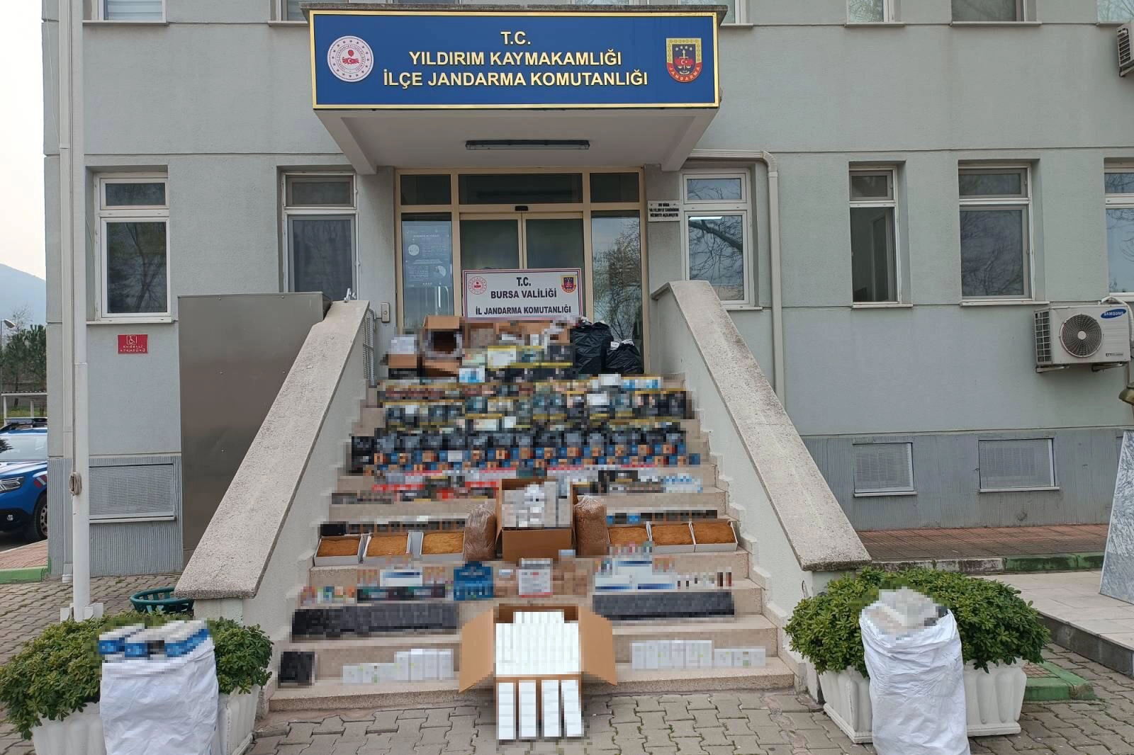 Bursa İl Jandarma Komutanlığı ekiplerince kaçakçılık ile mücadele edilmesine yönelik yapılan operasyonlar çerçevesinde alınan ihbarı değerlendiren Yıldırım İlçe Jandarma Komutanlığı ile KOM Şube Müdürlüğü ekipleri, Karapınar Mahallesi’nde bir işletmenin yakın çevresinde bulunan okullardaki öğrencilere ve vatandaşlara kaçak sigara sattığını tespit etti. Operasyon için düğmeye basan ekipler, A.T. (59) ve M.T.'ye (33) ait işletmede çok sayıda kaçak malzeme ele geçirdi. Ekipler, işletmeye yaptıkları operasyonda bandrolsüz olarak satılan ve yaklaşık değeri 1 trilyon 30 bin lira olan 24 bin 100 adet çeşitli marka sigara, 75 bin 499 adet makarona tütün basılmış sigara, 41 kilogram kıyılmış tütün, 38 bin 600 adet boş makaron, 58 bin 50 adet sigara kağıdı, 22 bin 540 adet sigara filtresi, 19 adet puro, 30 adet elektronik sigara ve 23 adet elektronik sigara likidi ele geçirdi. Bandrollü olarak satılan 69 bin 200 adet çeşitli marka makaron, 19 kilogram çeşitli marka tütün ve 82 adet çeşitli marka nargile tütünü ele geçirildi. Faturasız olarak satılan 6 adet bluetooth kulaklık ve 10 adet iPhone şarj aletine de el koyan ekipler, şahıslar hakkında adli tahkikat başlatarak 83 bin 709 lira idari para cezası kesti.