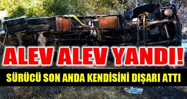 Bursa'nın Keles ilçesinde bir kamyon, freninin boşalması sebebiyle şarampole yuvarlanarak ormanlık alanda alev aldı.