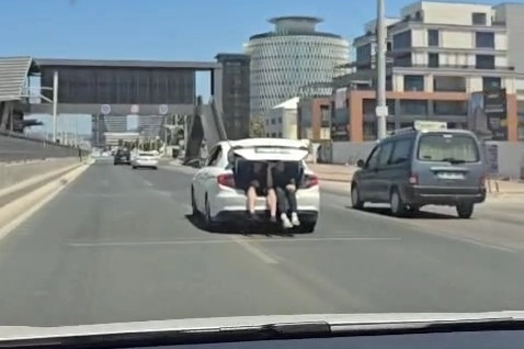 Osmangazi ilçesi İstanbul Yolu üzerinde seyir halindeki bir otomobilde yolcular bagajda taşındı. Bagaj kapısının da açık olduğu görülürken yolcular düşmemek için kapıya tutundu. Kilometrelerce süren tehlikeli yolculuk başka bir sürücünün kamerasına saniye saniye yansıdı.